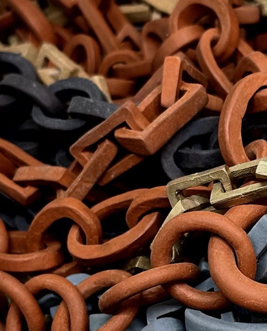 worked matte earth, juxtaposed with a bronze clasp “for a fair balance between natural and precious”