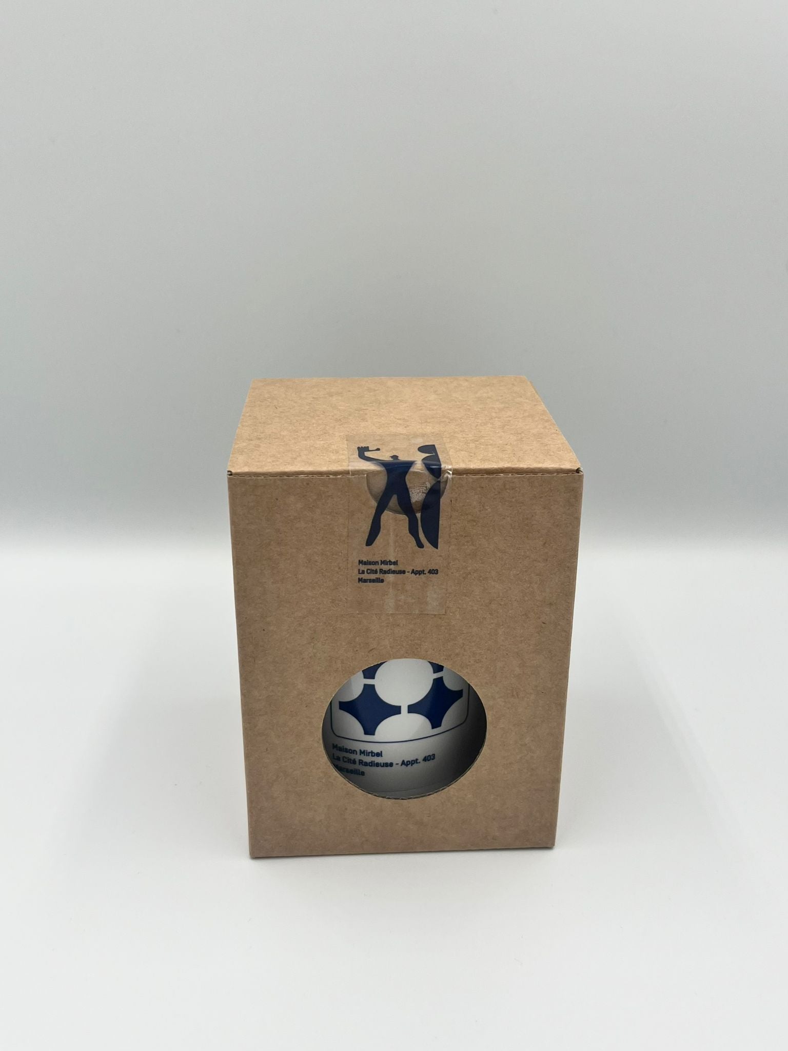 Les bougies sont vendues dans une boîte en carton ajourée, laissant apparaître le coloris et le motif de la bougie. Emballage fermé par un autocollant à l'effigie du Modulor de le Corbusier.