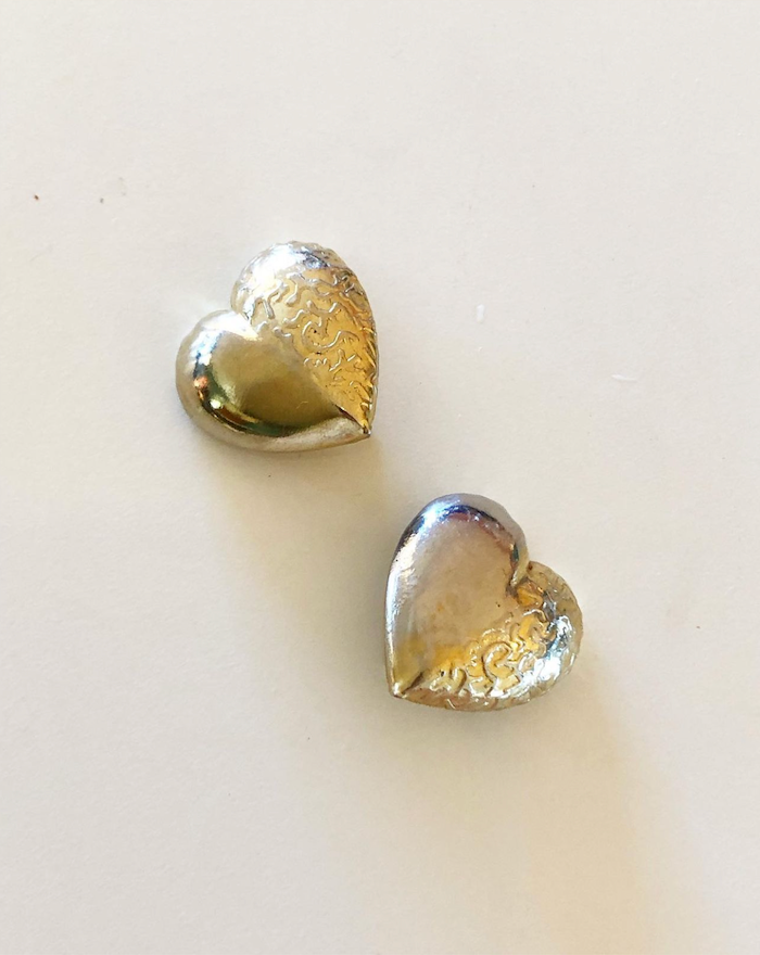 Clips coeur métal argenté à gauche et arabesques dorées à droite