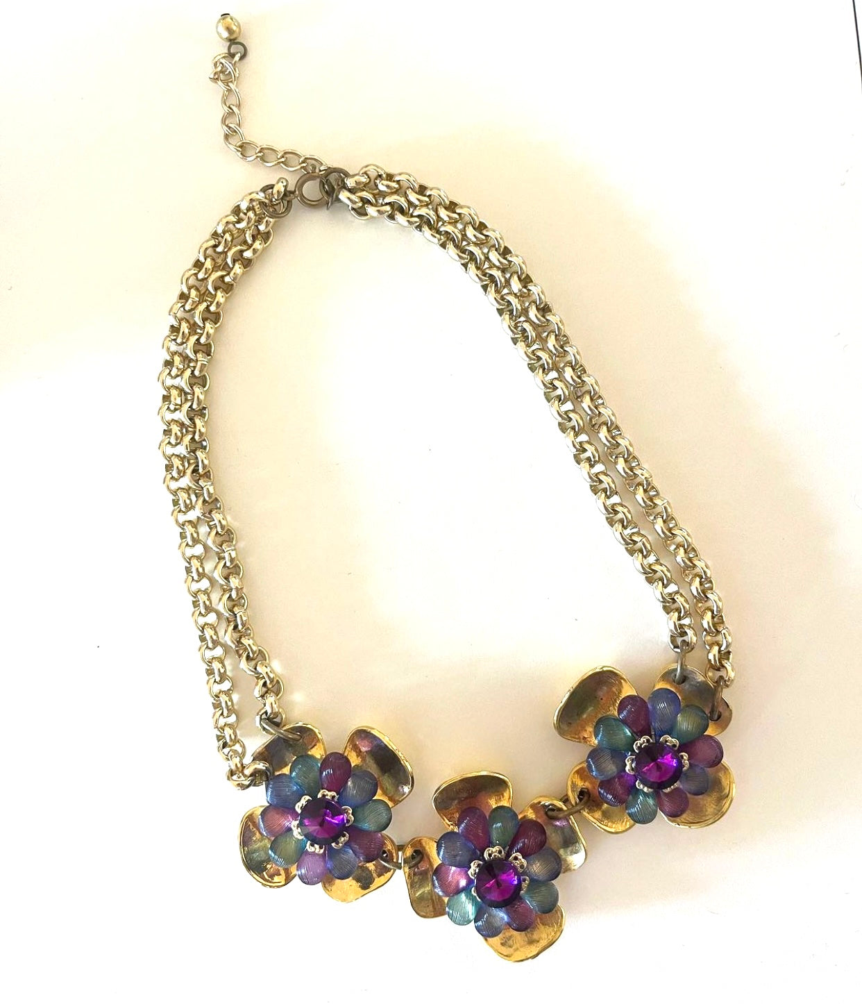 3 fleurs dorées rehaussées de perles mauves et bleues, strass purple au centre