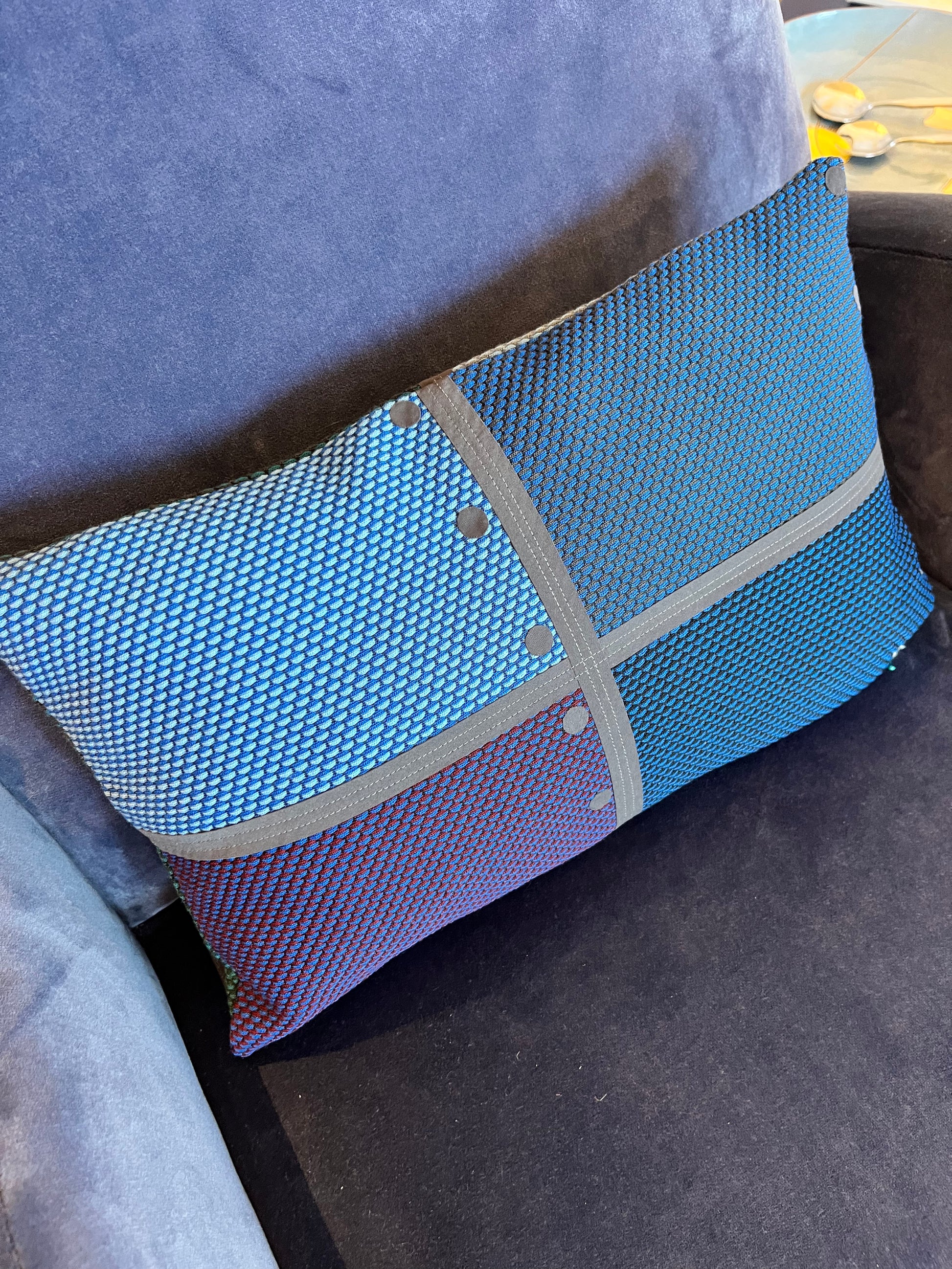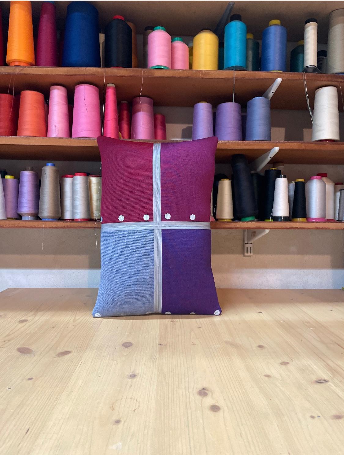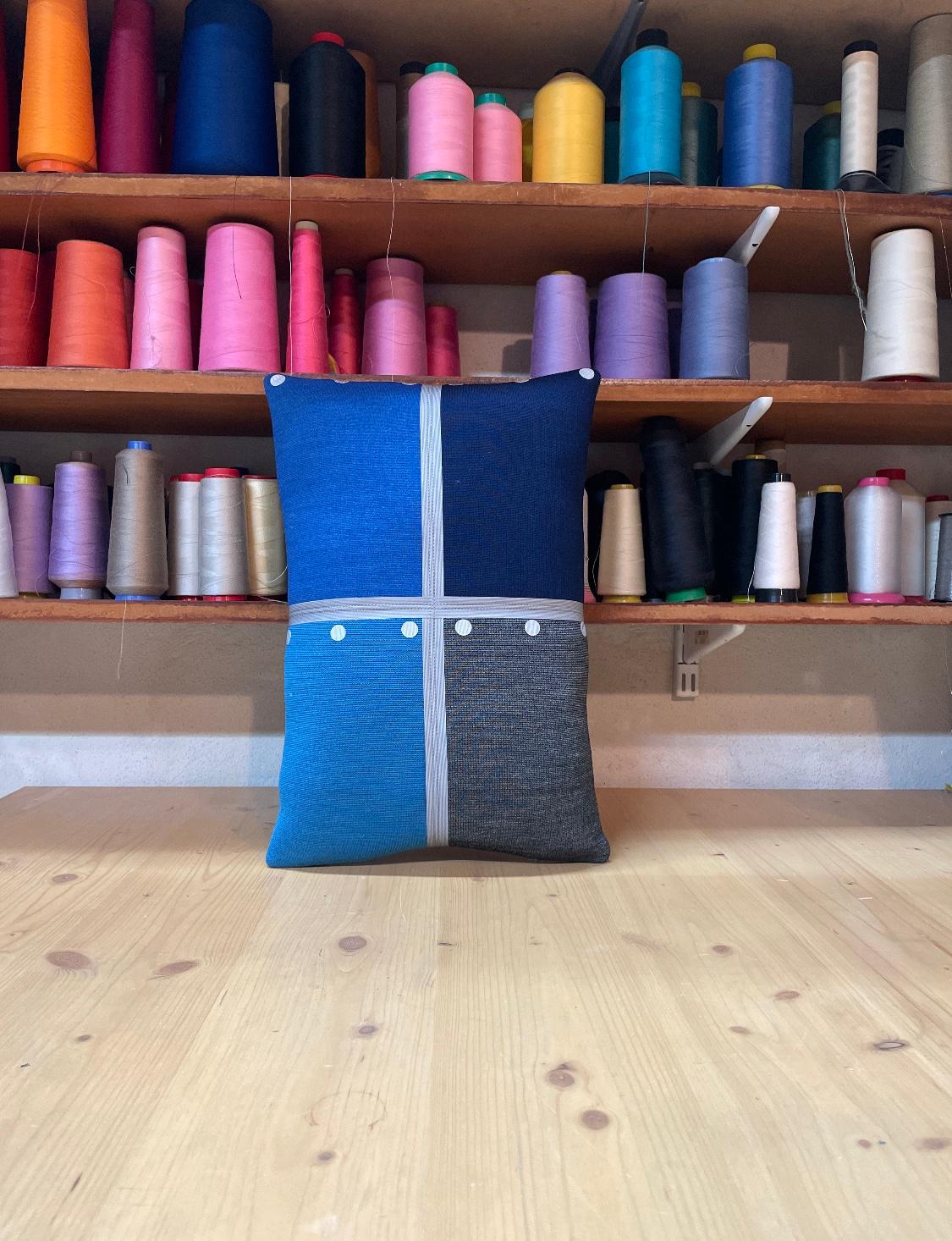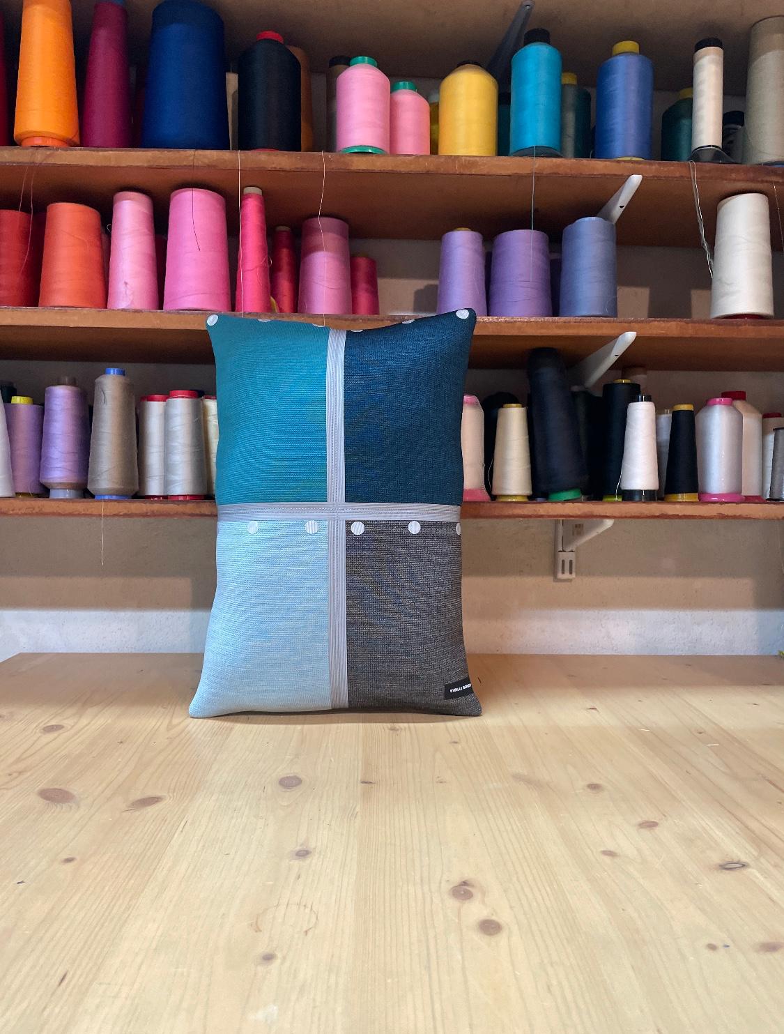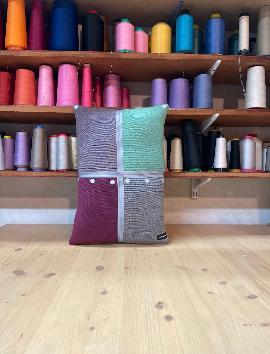 Cette designer textile utilise les échantillons d'anciennes collections de tissus de l'éditeur danois Kvadrat pour les recycler en coussins, tentures, couvres lits ou vêtements.