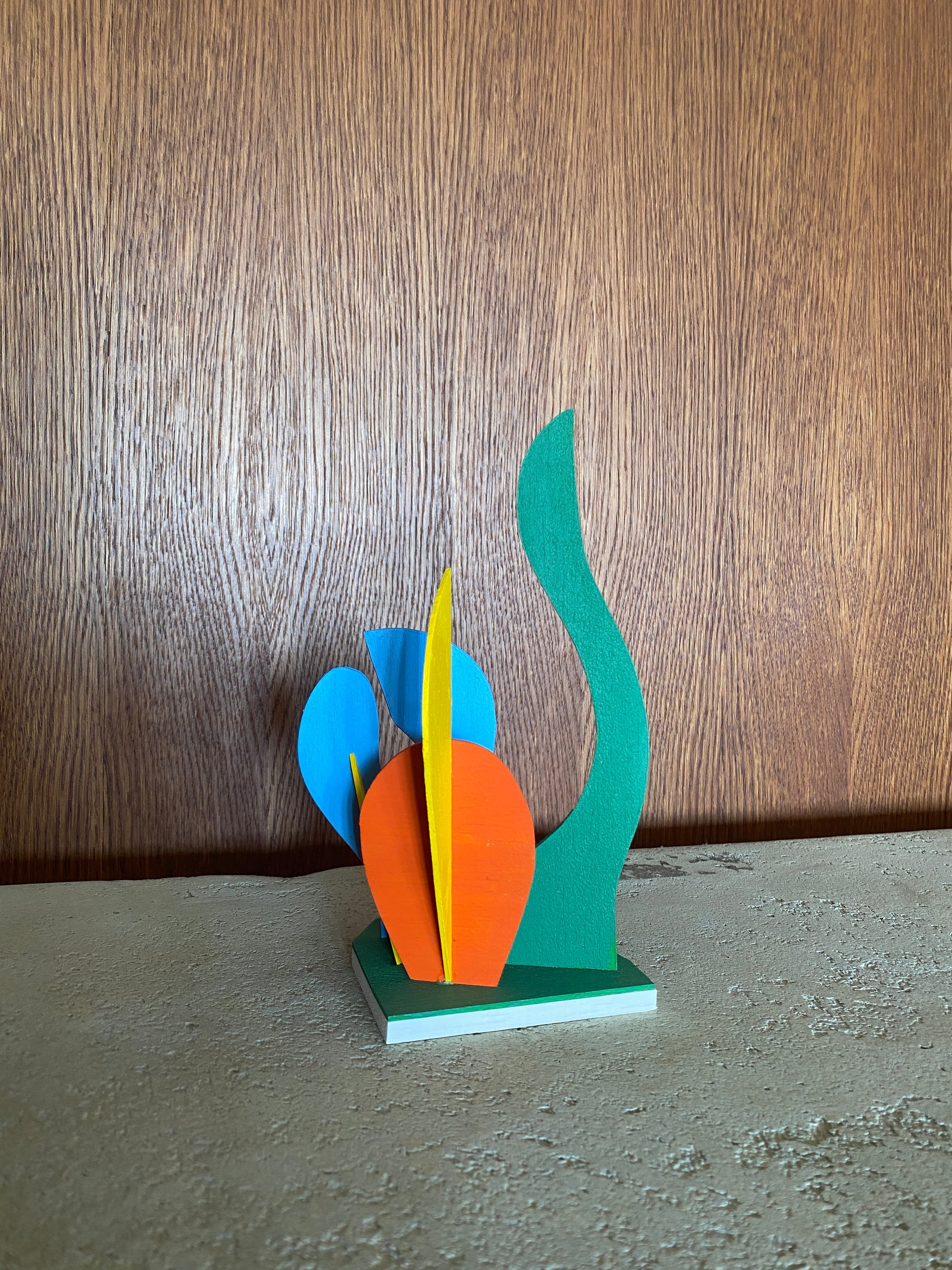 Son approche sensible et structurée fait dialoguer des formes géométriques, et des jeux de couleurs. Chaque pièce naît d'une intuition formelle, puis se construit progressivement par la juxtaposition d'éléments découpés, poncés et colorés. L'assemblage devient un langage, une syntaxe visuelle où la matière révèle sa matérialité et sa poésie.
