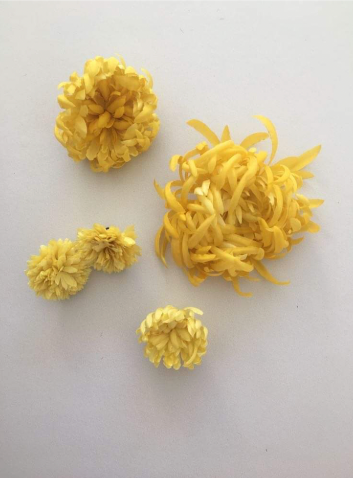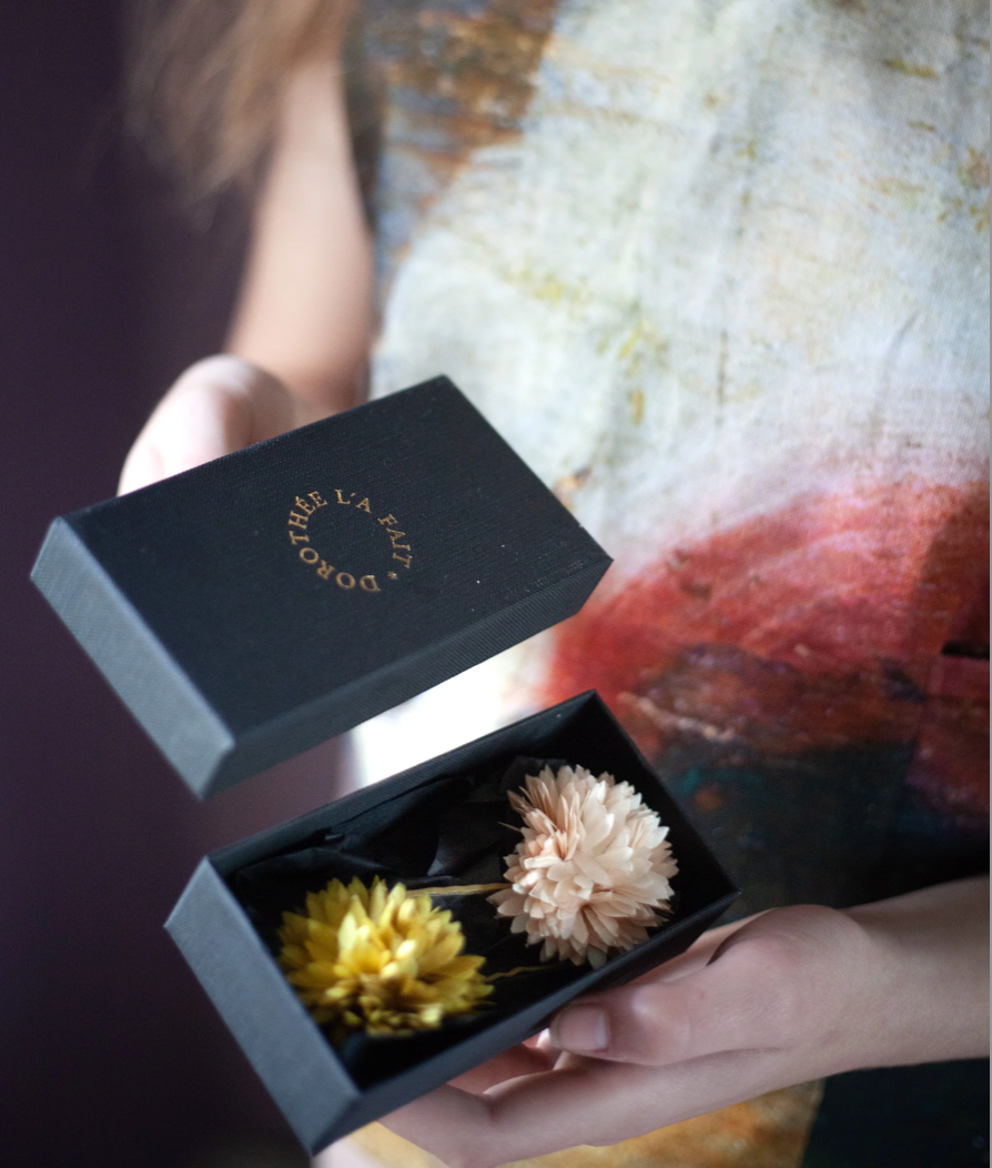 La soie est teinte artisanalement avec des plantes, créant des couleurs vibrantes et délicates, qui sont répertoriées dans le "jardin de couleurs" de Dorothée. Dans le Jardin des Simples, ne poussent que des couleurs vivantes, issues de la teinture naturelle. Selon des processus précis et spécifiques pour chaque plante, Dorothée extrait les colorants végétaux dans des bains pour y plonger ses bandes de soie. Les couleurs obtenues révèlent des vibrations uniques.