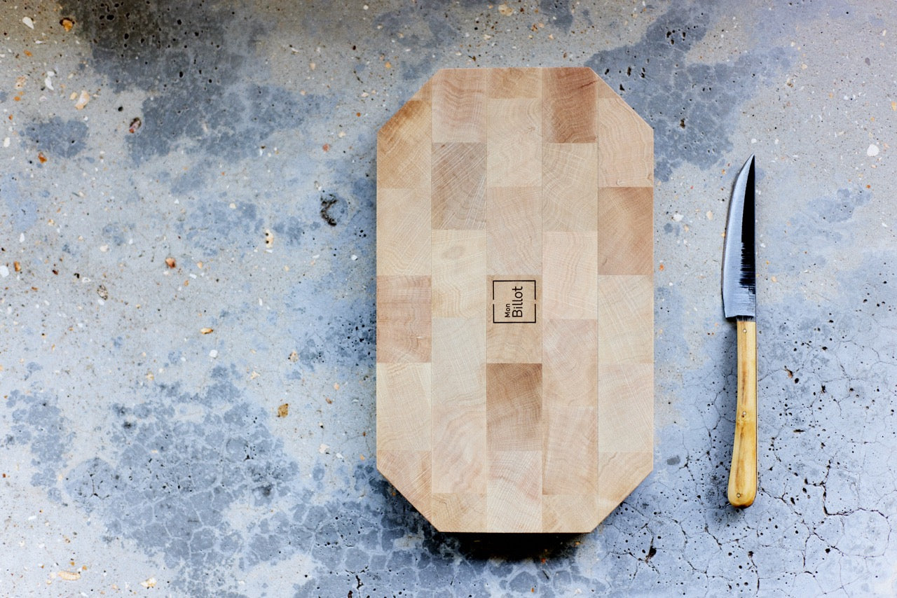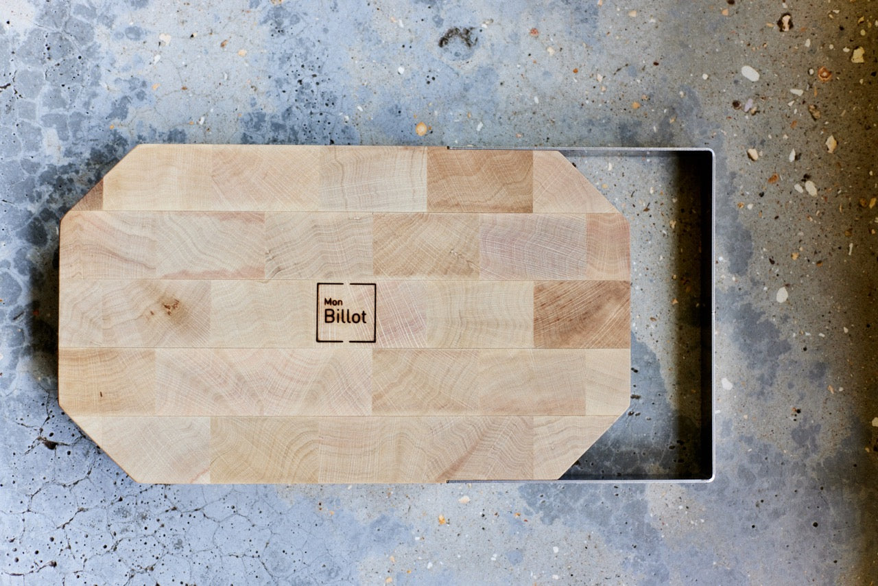 Chaque billot est unique, chaque morceau de bois est sublimé, les chutes chauffant l'atelier. Savoir-faire traditionnel, outil primaire modernisé, objet ancestral d'hier et d'aujourd'hui. 100% française, artisanale et engagée, Mon Billot est une marque d'objets, fait de matériaux choisis sur ses chantiers par François Bouvet. Le marbre, le bois et l'inox résistants aux assauts des Bouchers, des Fromagers et des particuliers.