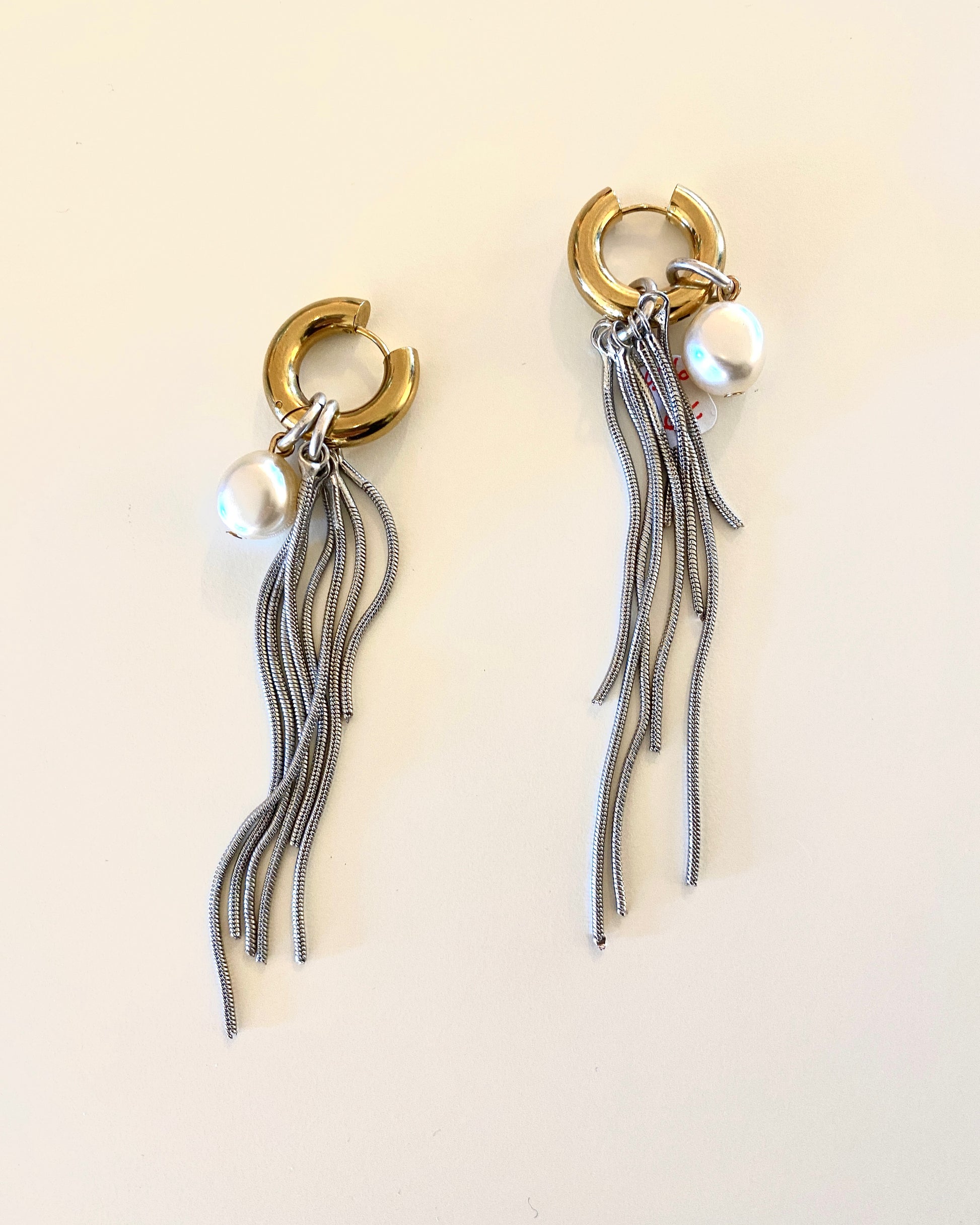 Larges anneaux dorés + perles + maille chaine argentée souple et longue