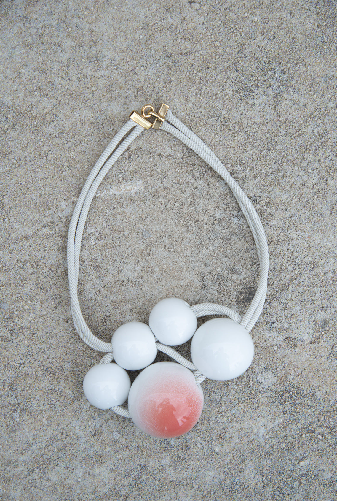 Les perles sont en faïence moulées. Creuses, elles offrent à ce bijou une grande légèreté. Emaillées par un artisan du Nord de l'Italie, avec lequel Marion Vidal collabore depuis plus de quinze ans.