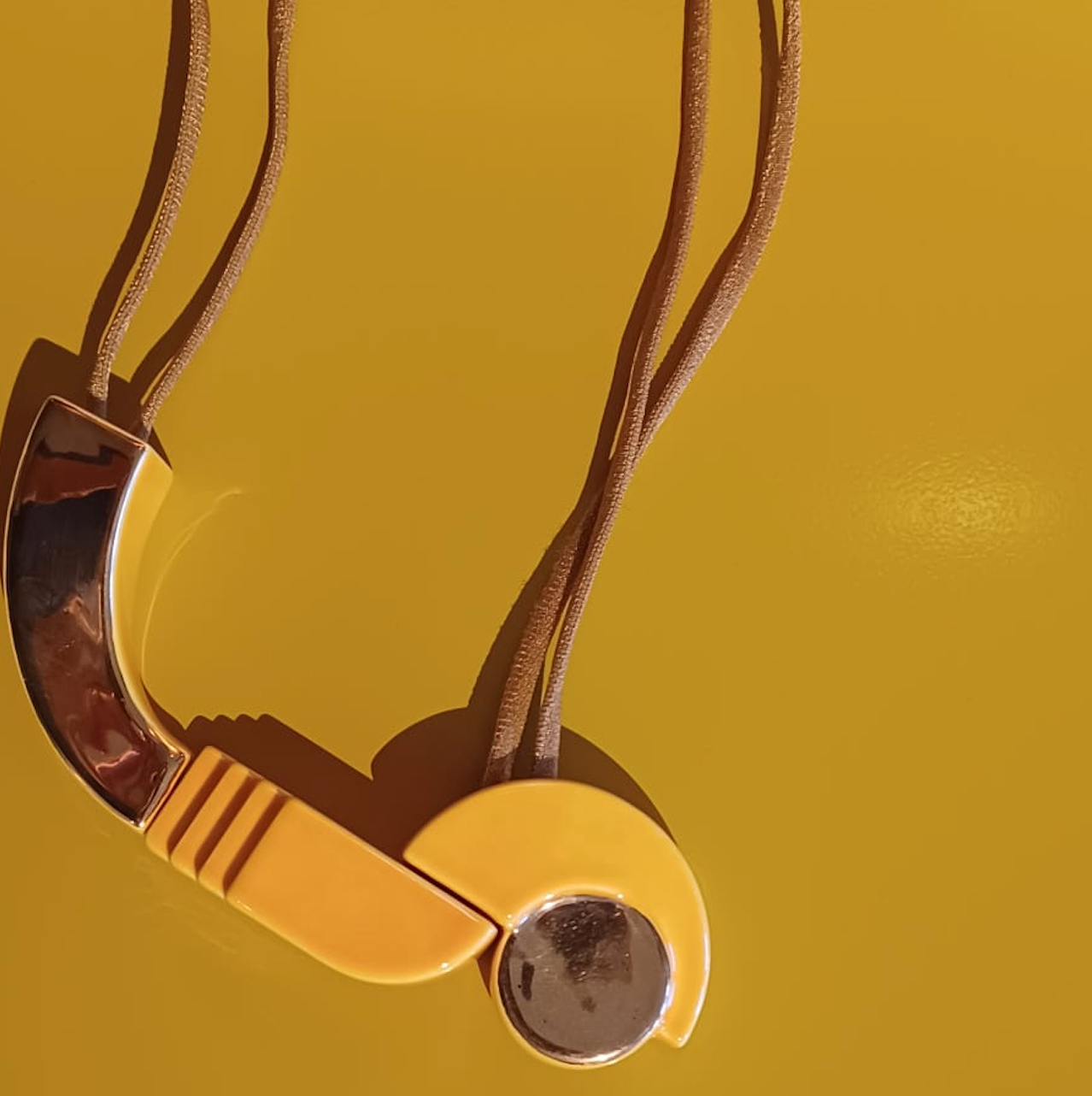 Collier Céramique jaune tournesol, émaillée, or. Cordon coton élastique doré. Fermoir en laiton doré. Eté 2017