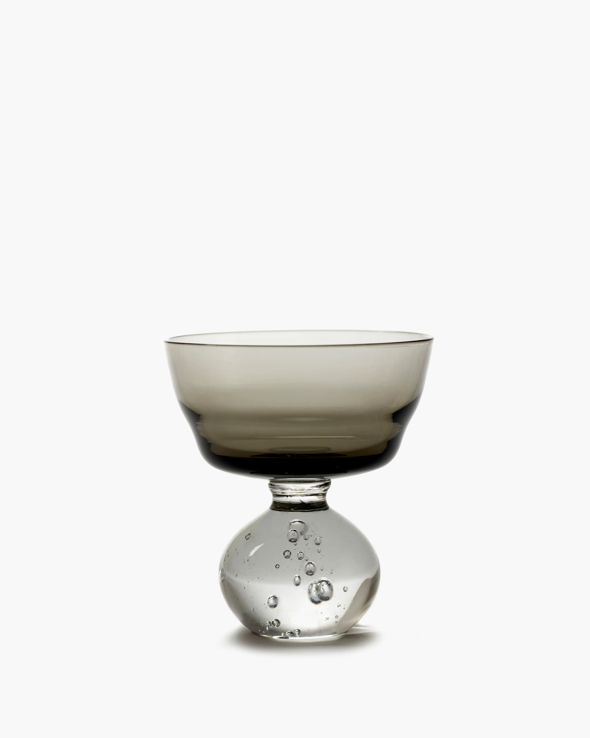 La forme est soufflée de façon atypique et des bulles d’air ludiques parcourent le pied du verre. Cette conception unique est également signée Bela Silva.